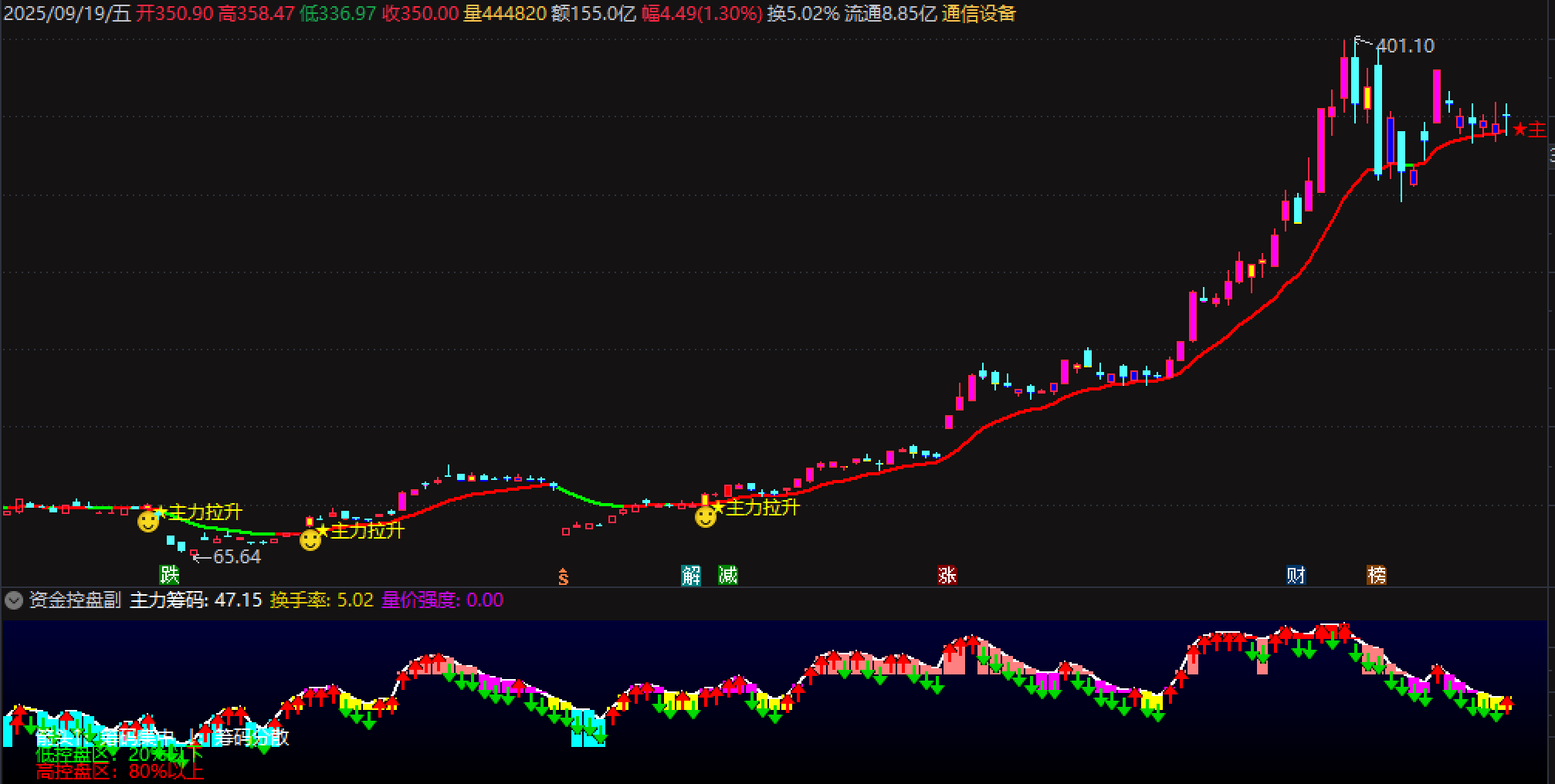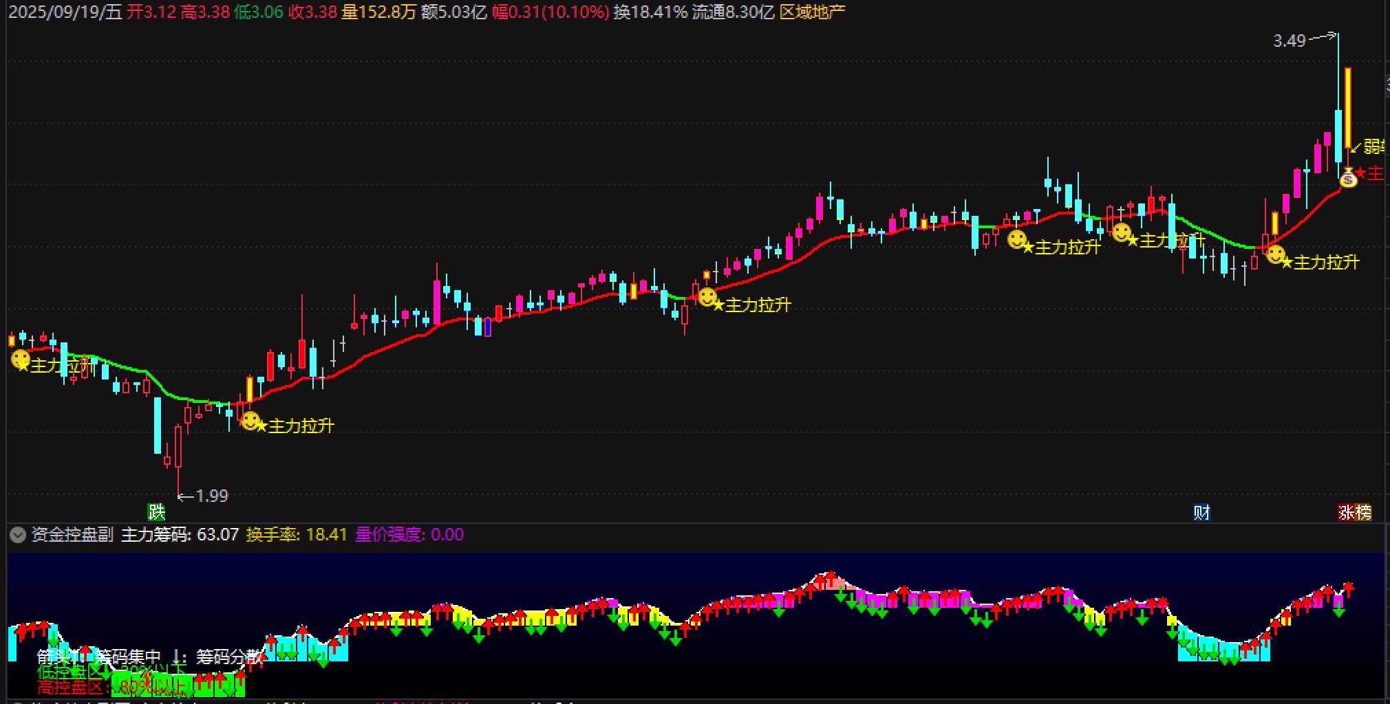 主力控盘:红色 K 线标注,对应 MACD 衍生指标上行且为正,提示主力主动介入;