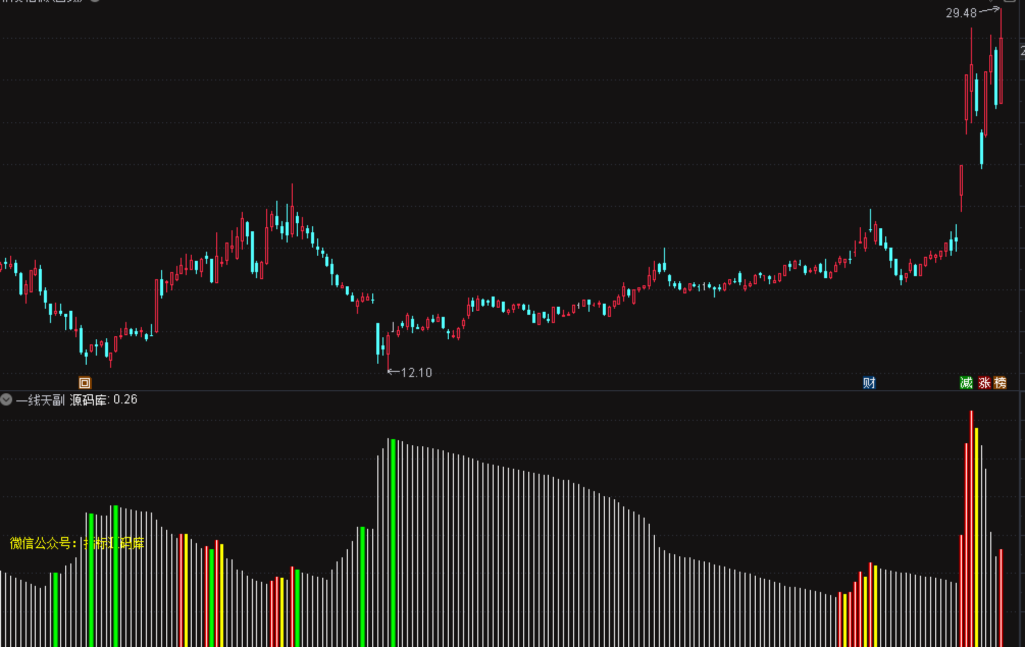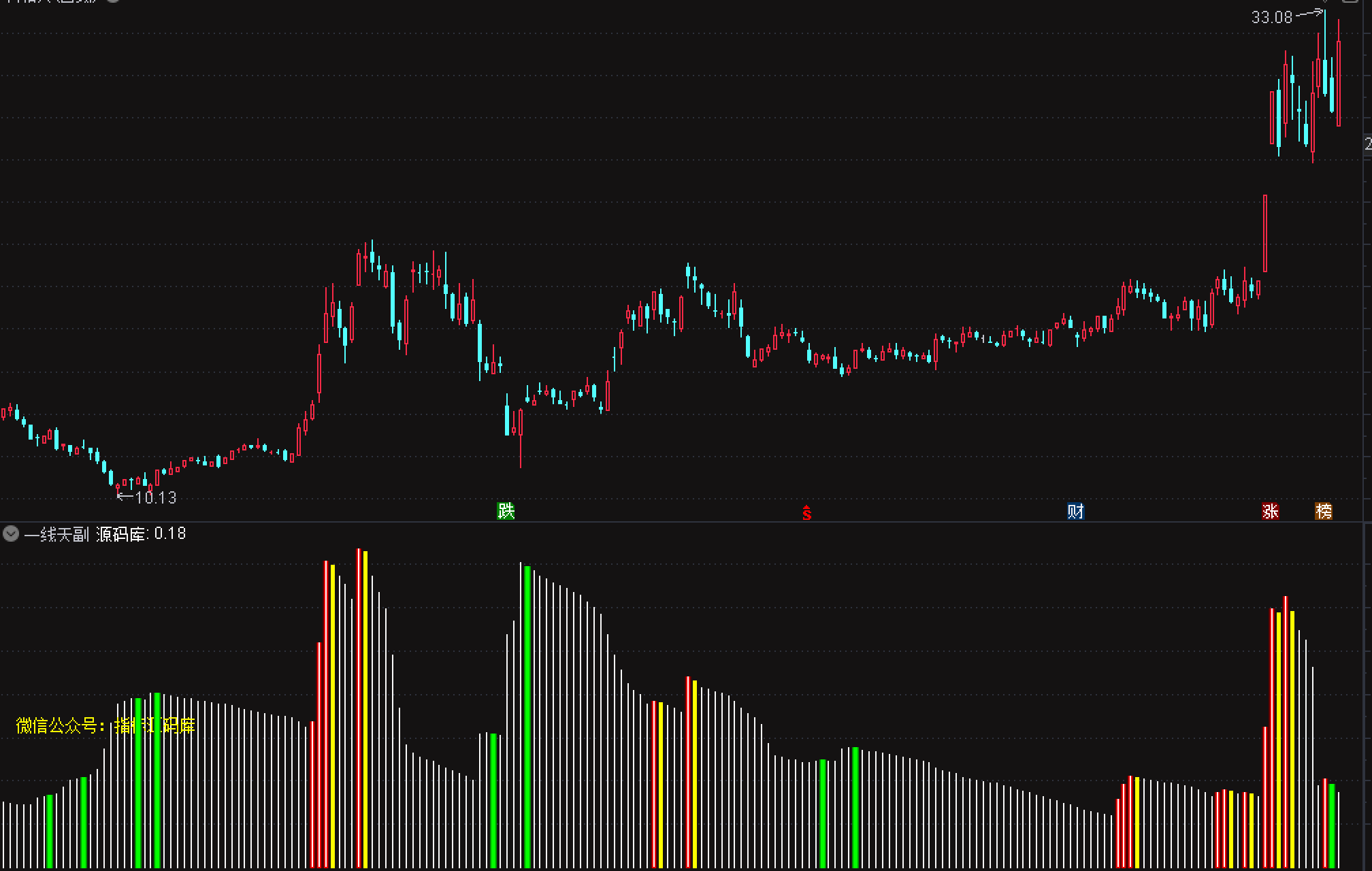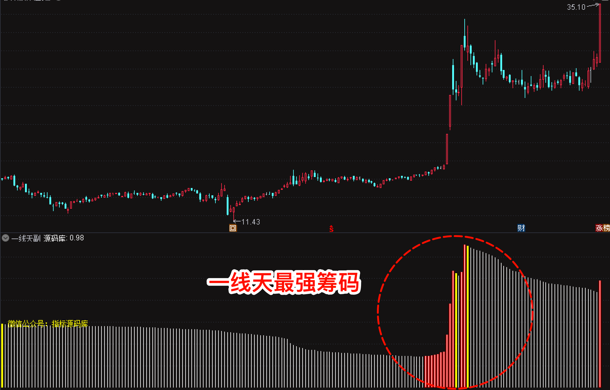 DRAWTEXT_FIX(C>O,0.01,0.51,0,’微信公众号:指标源码库’),COLORYELLOW;