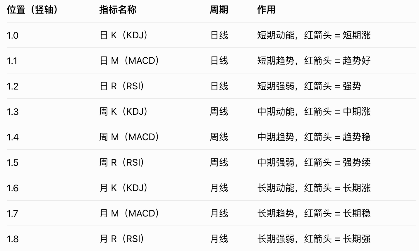 3 个周期:日线(短期)、周线(中期)、月线(长期)—— 确保短期能涨,中期能续,长期有支撑; -